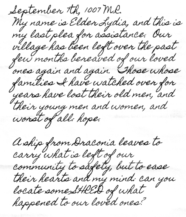 Place/Gathering Discovered: Bind The Tide Date: November 12, 1016 Transcribed by: Alexander Smith My name is Elder Lydia, and this is my last plea for assistance. Our village has been left over the past few months bereaved of our loved ones again and again. Those whose families I have watched over for years have lost their old men, and their young men and women, and worst of all, hope. A ship from Draconia leaves to carry what is left of our community to safety, but to ease their hearts and my mind, can you locate some SHRED of what happened to our loved ones? (Transcriber's note: The letter was written in cursive, and I may have made errors transcribing the document. I've stored the original letter alongside this transcription so that it can be referenced in case there are errors in this transcription.) |