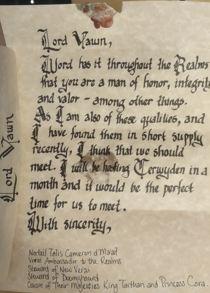 Nertail's Invite(a yellowed envelope and letter to Lord Vawn of Eagle's Rook, bearing a red wax seal with the letter N and fancy scrolling) Lord Vawn, Word has it throughout the Realms that you are a man of honor, integrity, and valor - among other things. As I am also of these qualities, and I have found them in short supply recently, I think that we should meet. I will be hosting Cerwyden in a month and it would be the perfect time for us to meet. With sincerity, Nertail Talis Cameron d'Ma'at Verai Ambassador to the Realms Steward of New Verai Steward of Doomghaurd Cousin of Their Majesties King Taithan and Princess Cora. |