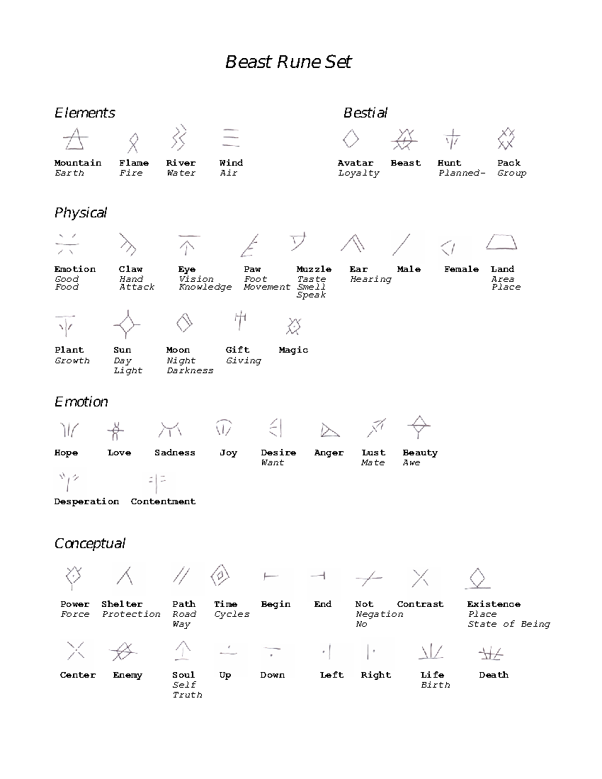 Beast RunesThe Beast Rune set is a symbolic rune set, rather than the simple letter-conversion rune sets often encountered when adventuring. When spoken aloud, they can act as a sort of bridge between the feral and rational mind. When written, the Beast Runes carry great mystic power as a direct conduit to the Beast. Runic inscriptions form the basis of many rituals used by the Beast's Avatars. |